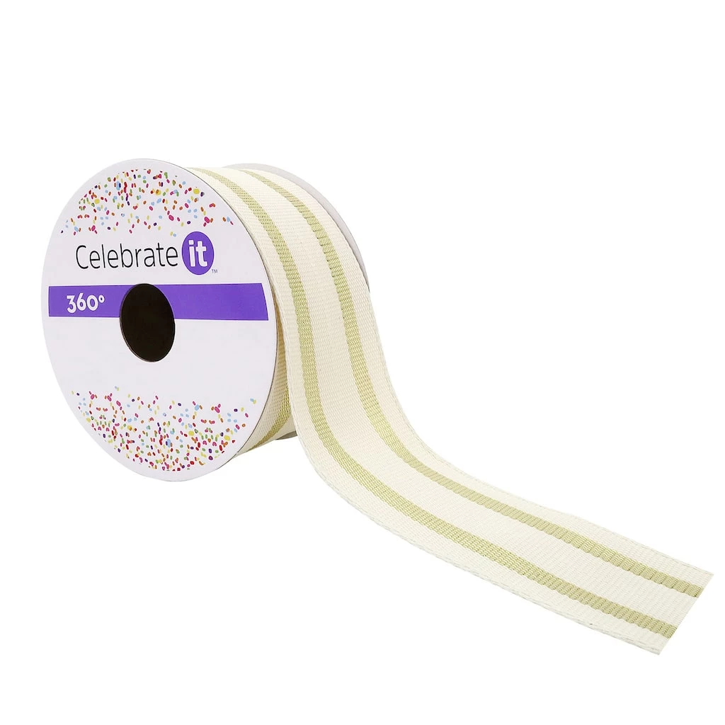Add this ribbon to your gift wrapping and DIY projects. This polyester ribbon with a metallic gold ticking striped accents will be a lovely addition to your finished projects.