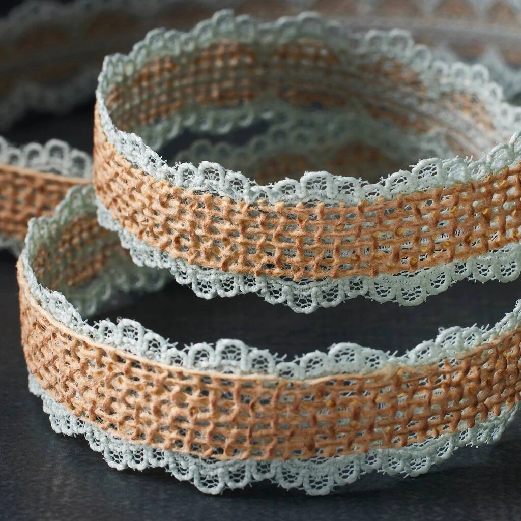 Give your wedding décor, home décor, gift wrapping or floral arrangements a rustic look with this trendy ribbon. This faux burlap will give your craft projects an amazing textured look. The ribbon is constructed with open work lace on the bottom and burlap running down the center. This creates a beautiful, contoured lace edge.