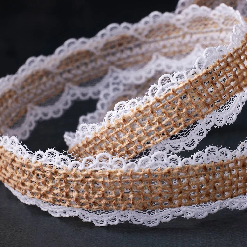 Rustic burlap and delicate lace combine to create this country chic ribbon. This woven faux burlap is layered on top of a pretty lace base and can be utilized in a variety of ways such as decorating chairs for your next special occasion.ย