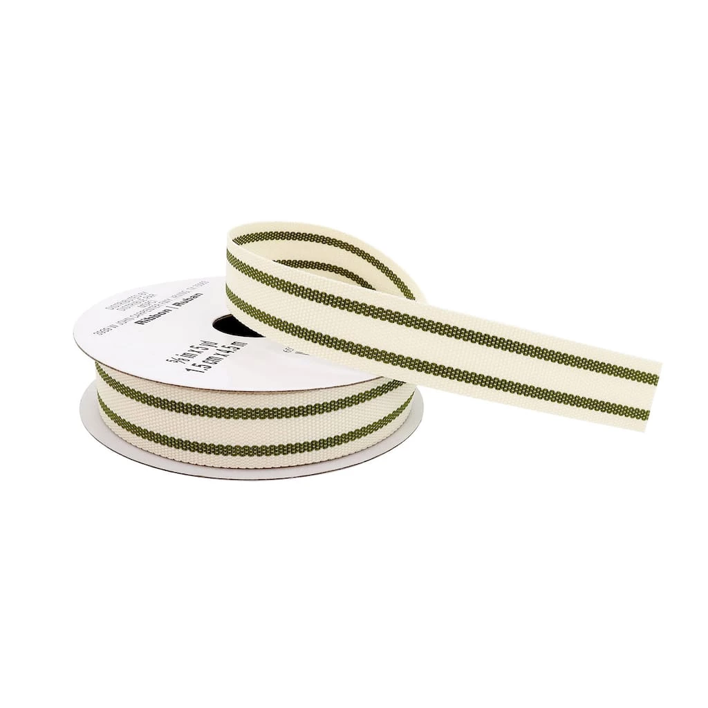 Add this ribbon to your gift wrapping and DIY projects. This polyester ribbon with a olive ticking striped accents will be a lovely addition to your finished projects.