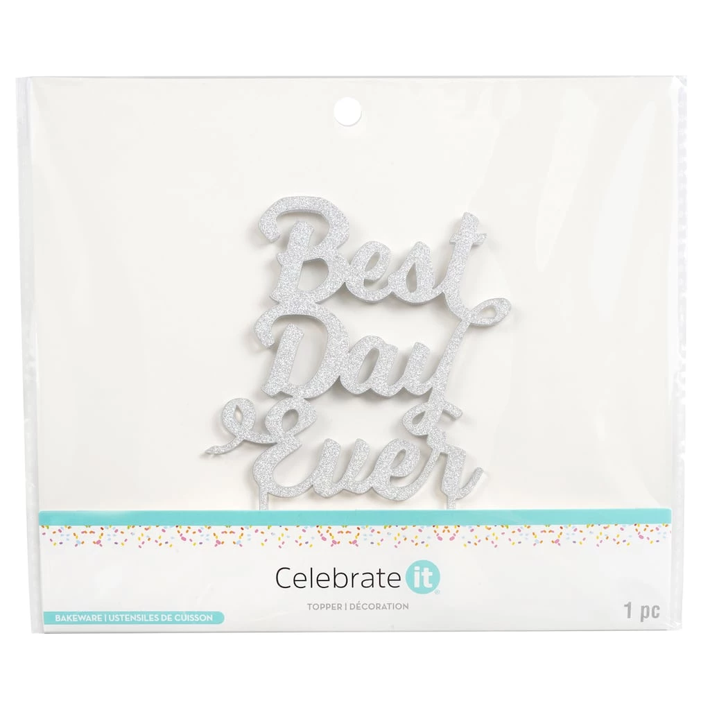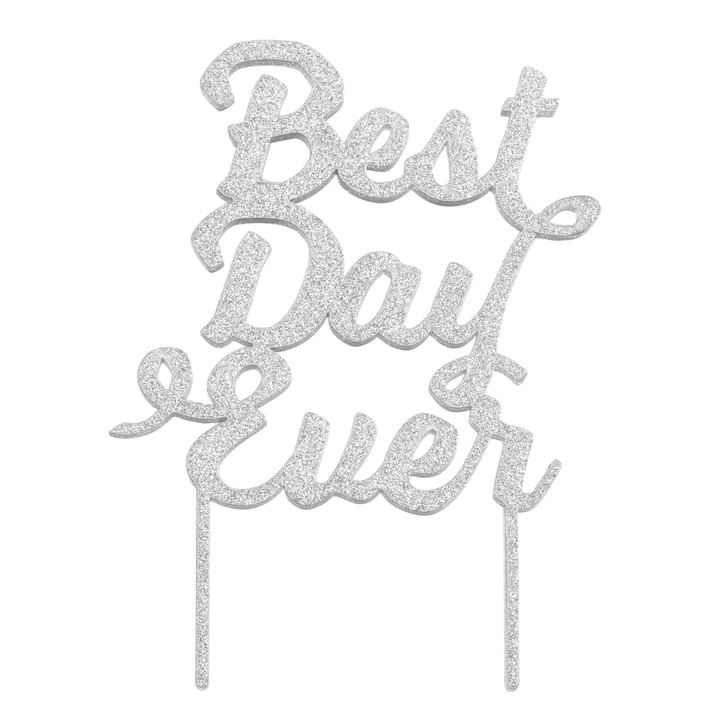 Add style to your celebration with this festive cake topper featuring the words “Best Day Ever” in silver glitter letters. This topper will add an extra splash of fun to your baked goods.