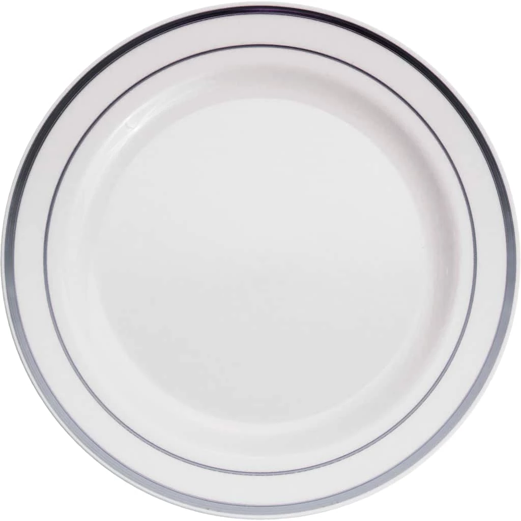 Add a touch of elegance to your party table with these silver-trim lunch plates by Celebrate It. Serve delicious appetizers, entrees, desserts and more in these plastic plates. Pair them with silver spoons and decorations to enhance your table setting.