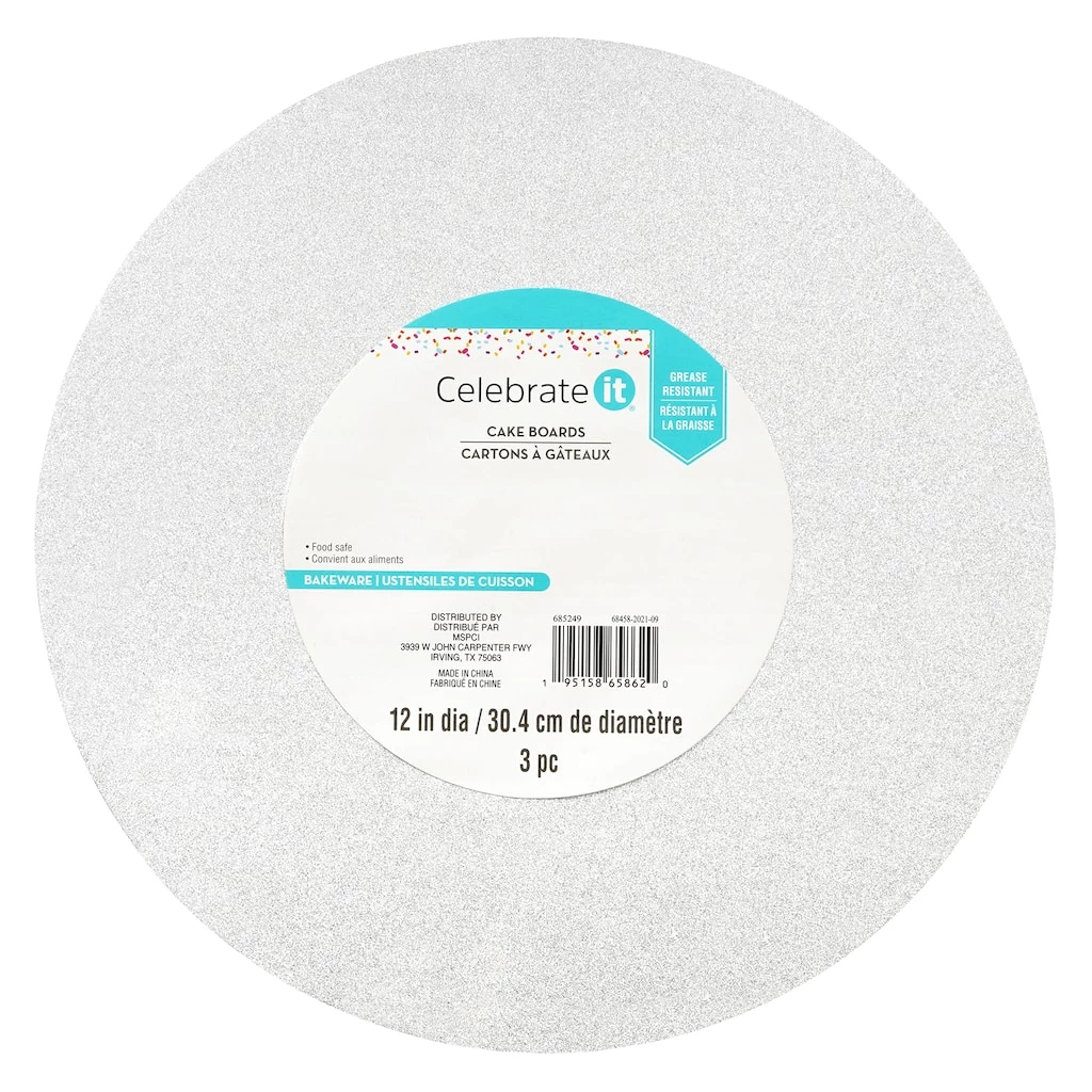 Show off your beautifully crafted homemade cakes with an extra bit of flair using these glittery silver cake boards from Celebrate It. Grease resistant and food safe, use with a complimentary cake stand or platter to display your creations at bake sales, school and office parties and other fun celebrations.