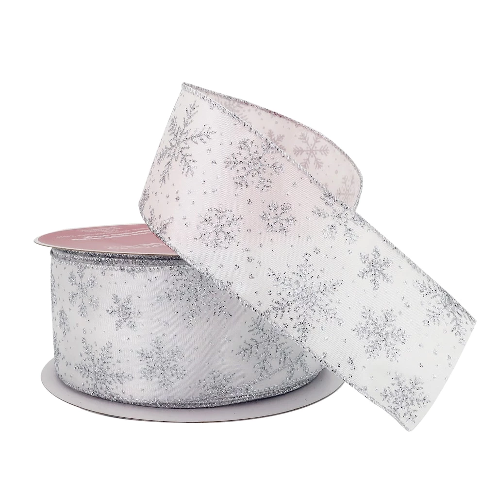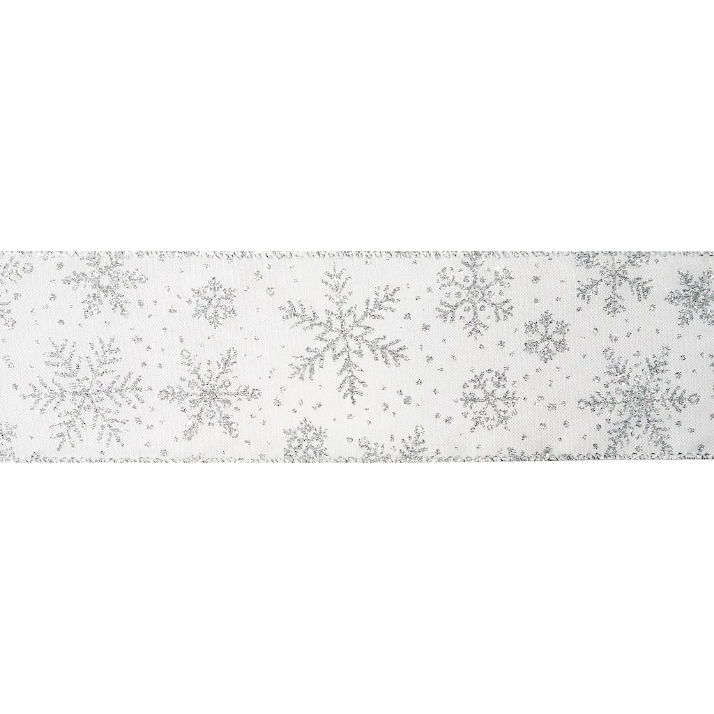 Give your Christmas gifts and craft projects a lovely bit of holiday charm with this wired white taffeta ribbon with a silver snowflake pattern from Celebrate It. Use to embellish ornaments, pair with lights and greenery to create festive garlands and wreaths, dress up floral arrangements, put the finishing touch on presents and more!