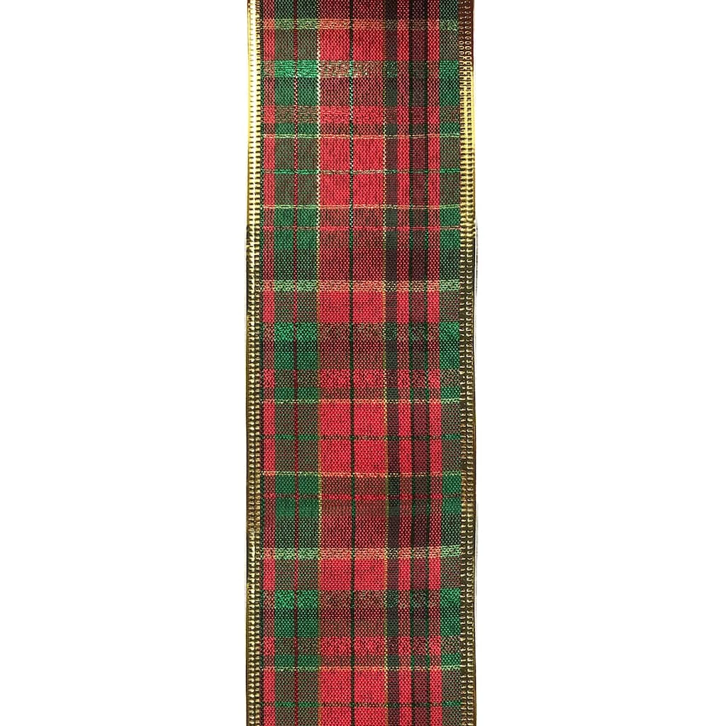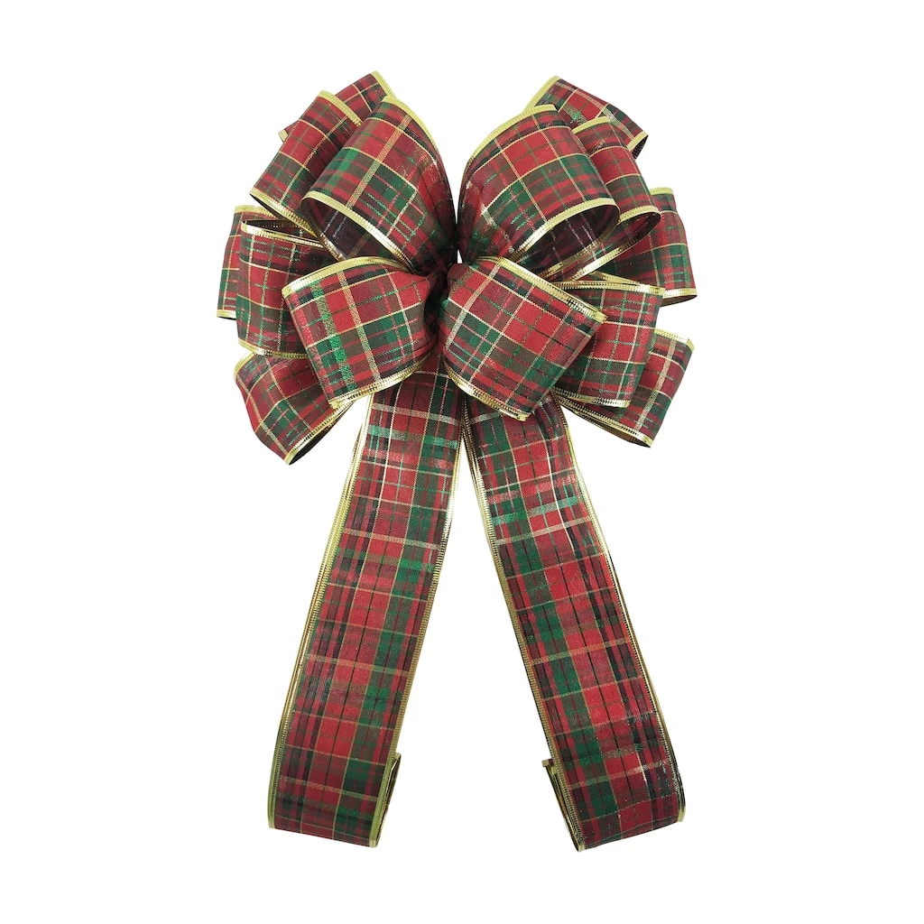 This festive tree topper bow made with a red and green plaid fabric is a wonderful way to add a a bit of charm to your holiday tree. With gold metallic sewn edges and two long tails of ribbon to drape over the top of your evergreen, this piece is a fantastic way to finish your Christmas decorating.