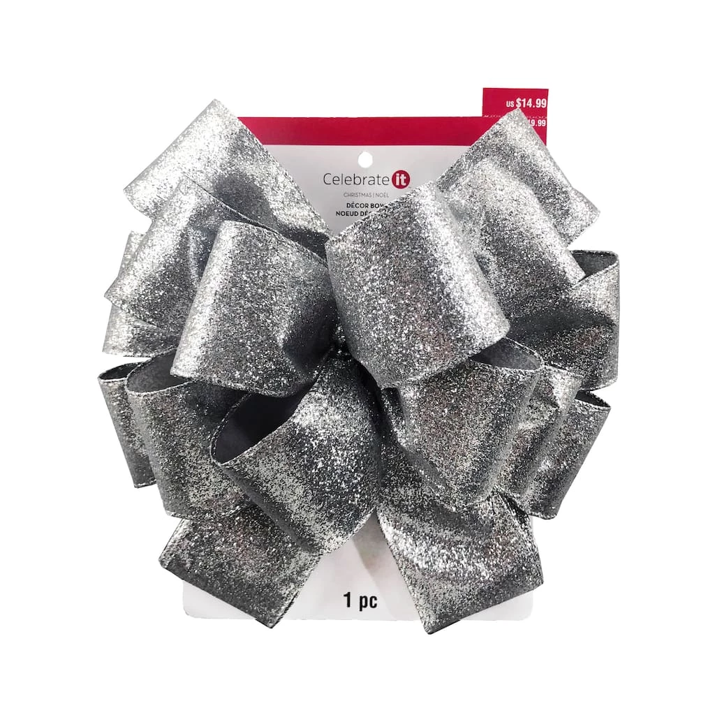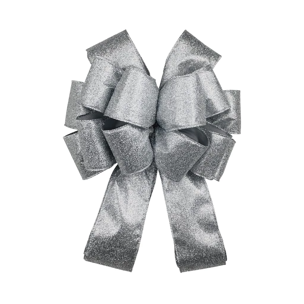 This charming tree topper bow made with a glittery silver fabric is a wonderful way to add shimmer and shine to your holiday tree. With sewn edges and two long tails of ribbon to drape over the top of your evergreen, this piece is a fantastic, festive way to finish your Christmas decorating.