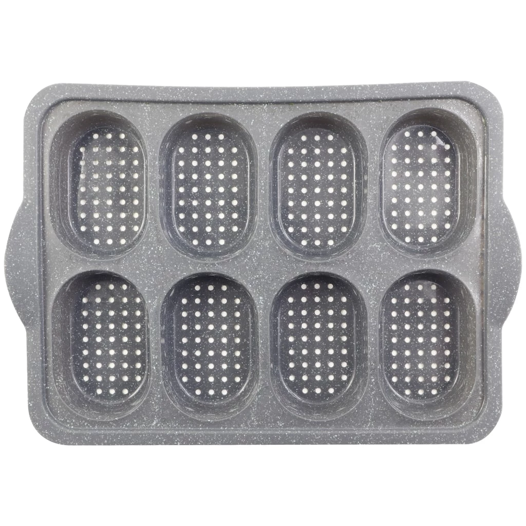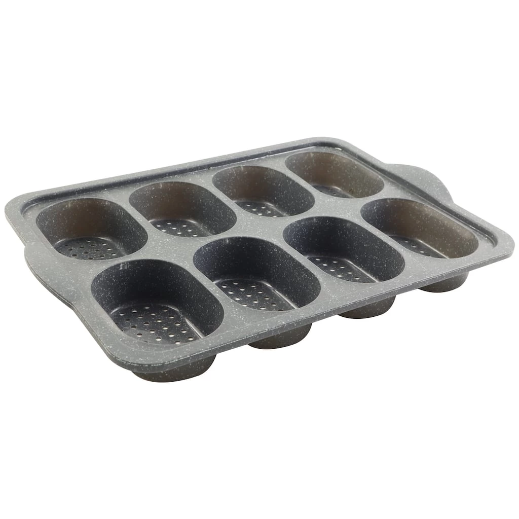 Bake delectable mini bread loafs with this unique baking pan. It features rigid steel around the outside for secure handling. Additionally, each cake cavity is comprised of silicone to allow cakes to pop out with ease!