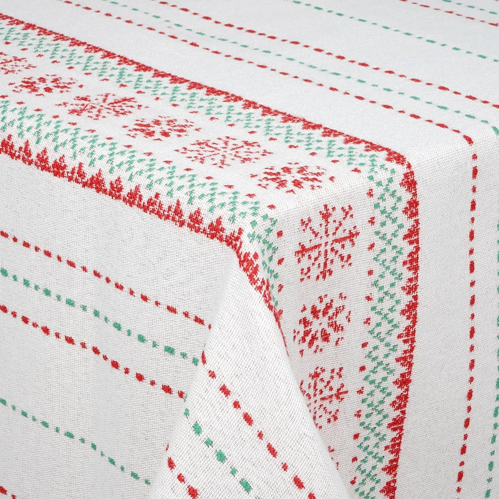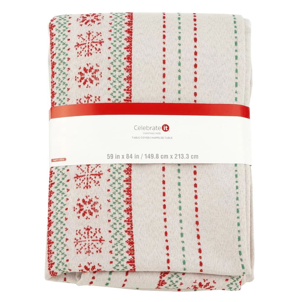 This snowflake print table cover is perfect for lending your Christmas festivities a vibrant touch. Pair it with a stunning floral arrangement to complete your seasonal display.