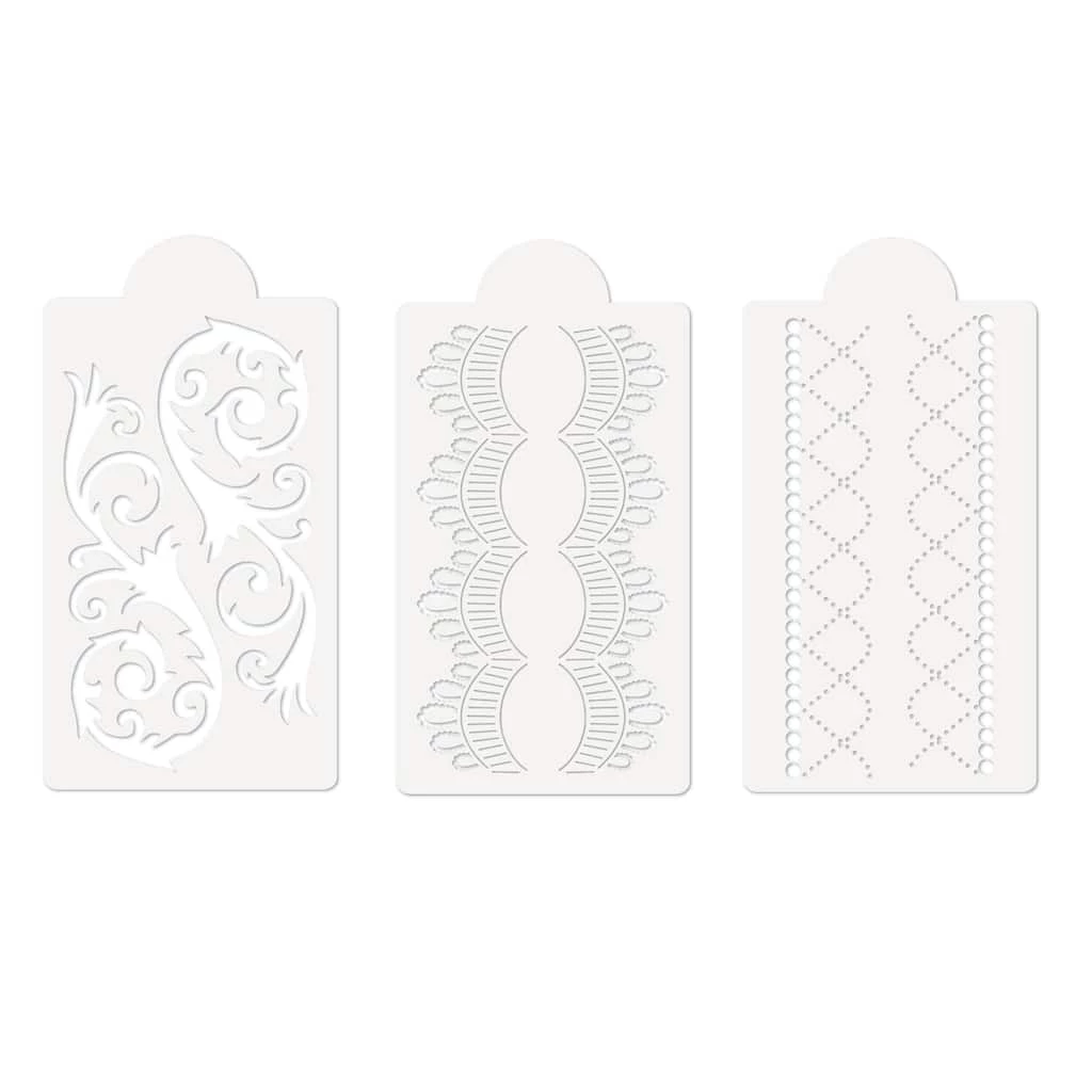Add fun decorative patterns to cakes and other sweet treats with these stencils! Use with frosting or airbrushing, this set includes elegant prints to customize how you like.