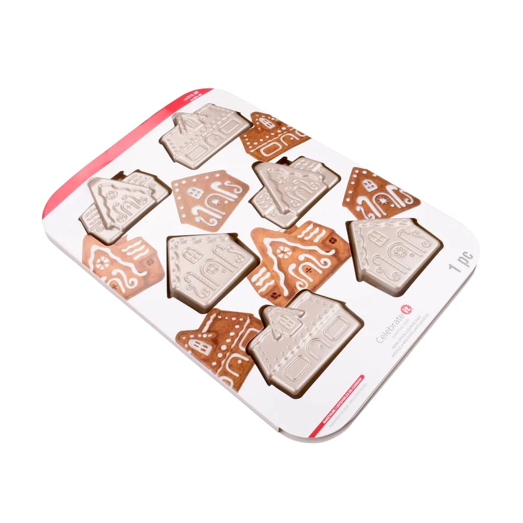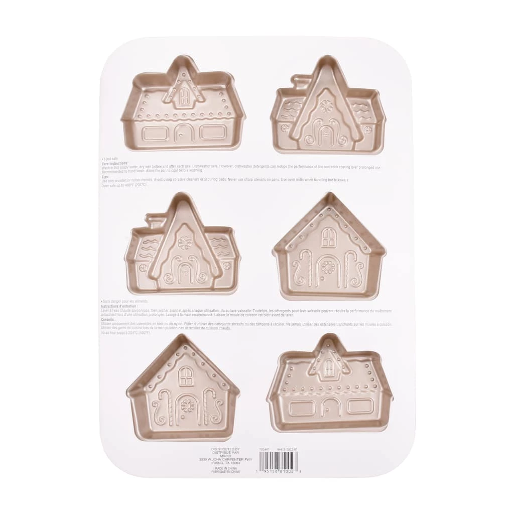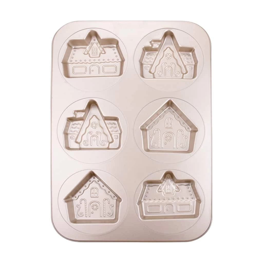 Create fun and tasty treats with this 6-cavity cake pan. It features gingerbread house designs stamped in gold carbon steel material. Durable, yet, lightweight, this pan will be a great addition to you holiday baking tools.