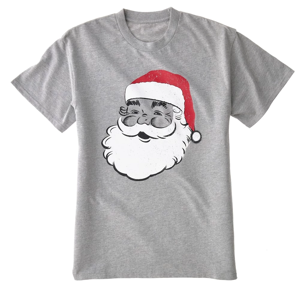 Ring in the jolly season by donning this playful t-shirt from Celebrate It. Featuring a classic Santa print on gray, this fun, festive tee is sure to bring joy at holiday parties and family get togethers this Christmas.