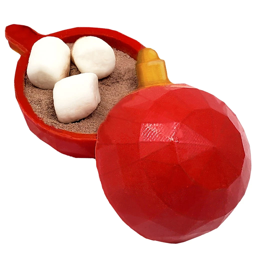 Three-part molds are used to make hot chocolate bombs for gifts or desserts for any celebration. This ornament mold is perfect for your Christmas creations.