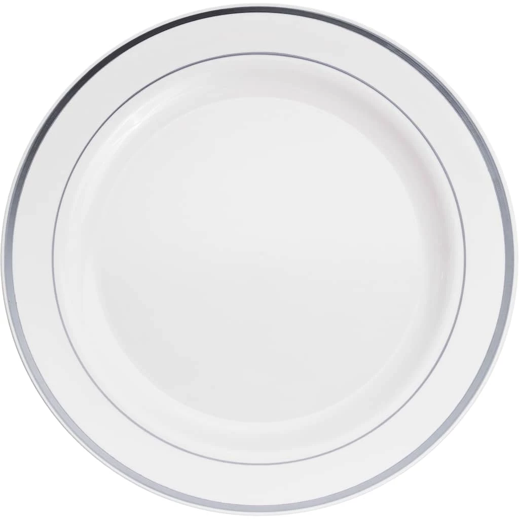 Elevate the presentation of your delicious party meals with these round banquet plates by Celebrate It. Featuring a sliver trim around the edges, these plates add a touch of elegance to your dinner table. Use these plastic plates to serve entrees, desserts and more.